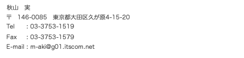 秋山実 1930年生まれ。青山学院大学文学部英米文学科卒業。桑沢デザイン研究所リビングデザイン研究科(写真)卒業。大辻清司、北代省三両氏に師事。 1965年に新分野の工業写真家として独立。そのご建築写真も始める。 1973 年から大型カメラで顕微鏡写真を始め、結晶などの抽象写真を広告関係に 使うという新しい分野を開拓。千葉工業大学、東京工芸大学(短期)、桑沢デザイン研究所、東京YMCAデザイン研究所などの非常勤講師を務め た。 全国カレンダー展、全国カタログポスター展などで受賞。個展5回の 他、協会展、グループ展、世界デザイン博など多数出品。 日本写真芸術学会 平成25年度 芸術賞 受賞・・・・ 2013年6月15日
